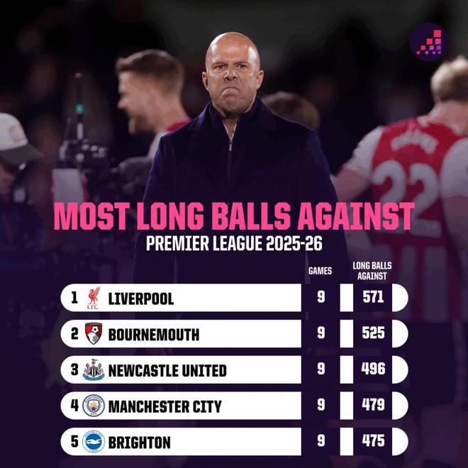 从统计数据可以看到,利物浦新赛季9场英超比赛,被对手用571次长传发起攻击,是所有球队中最多的。